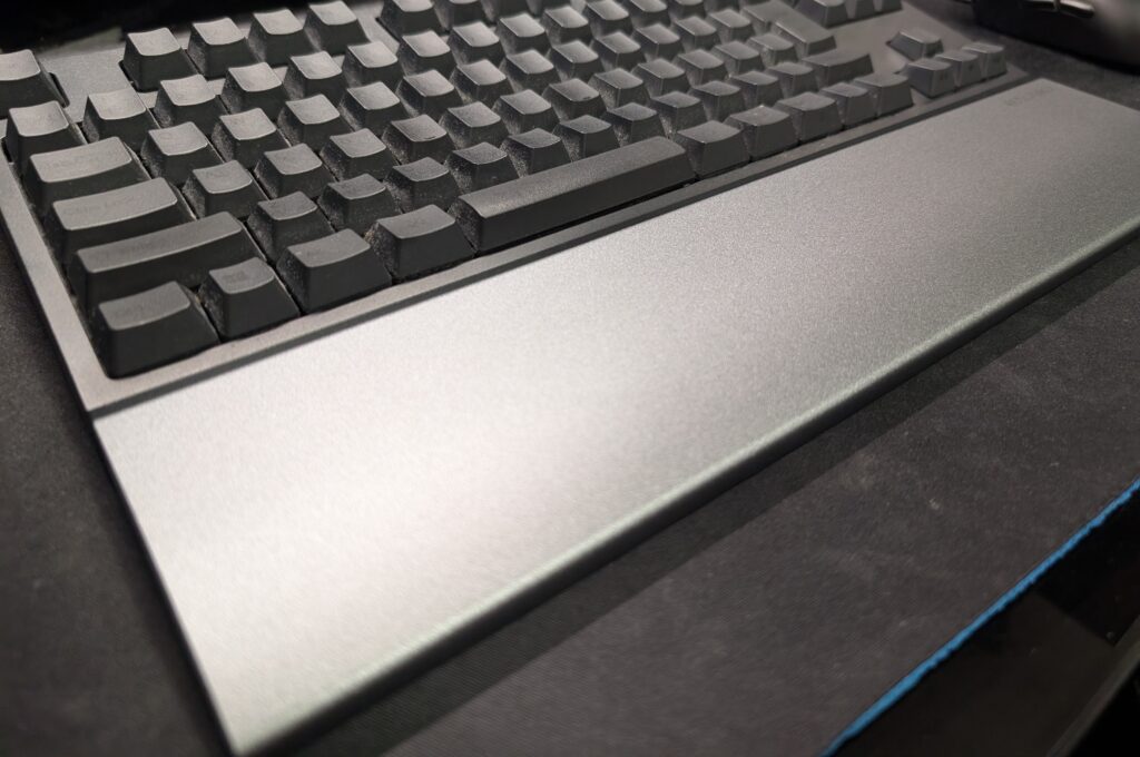 リアルフォースのパームレストは珍しいことにアルミ製。触っても変形しないという点では木材に近いと思うんだけど、触り心地が硬すぎたりしないのかな?という点も気になるので試してみる。