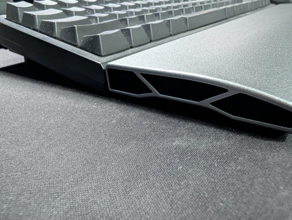 横から見てもらうとわかる通り、手首を置く部分と打鍵を行う指の高さに差がないので、指がキーボードの側面に引っかかることがなくなり、自然なタイピングができるようになった。